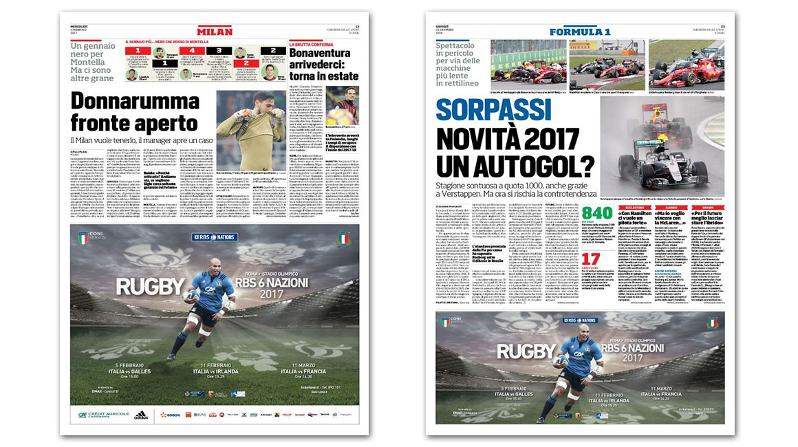 Ci siamo occupati anche dei materiali di cobranding (come ad esempio la partnership con Frecciarossa o con Groupon). Abbiamo curato la progettazione grafica di molti allestimenti dello Stadio Olimpico, le grafiche dei LED a bordo campo, le slide dei maxischermo. Infine abbiamo realizzato i materiali grafici per l’allestimento delle sale hospitality.